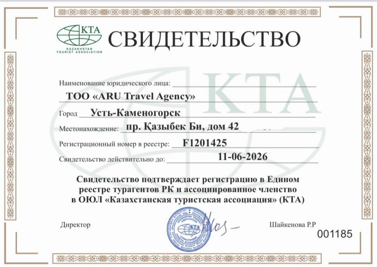Наше турагентство является членом Казахстанской Туристской Ассоциации (КТА) и внесено в Единый реестр турагентств Республики Казахстан. Также мы зарегистрированы в системе «Камкор», что гарантирует нашим клиентам прозрачность, надежность и защиту их прав при организации путешествий.